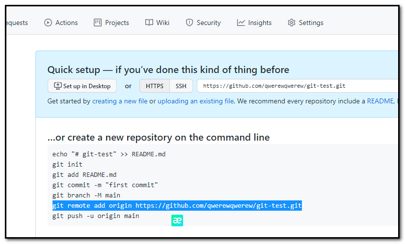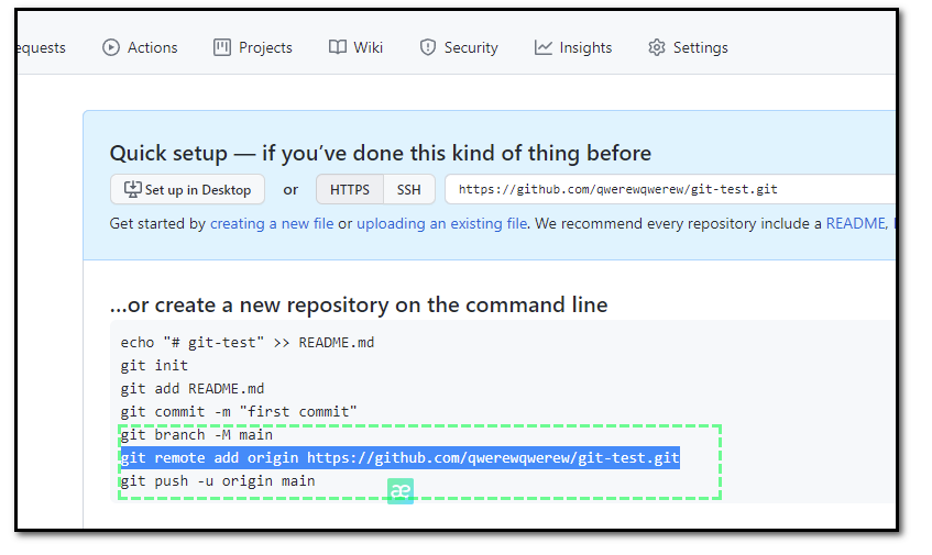 - 깃허브 리포지토리 의 명령어 복사 표시된 세줄 모두 복사하여 붙여 넣는다