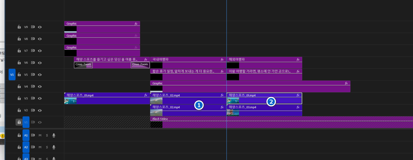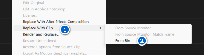 - 프로젝트 패널에서 교체할 클립 선택후 2의 클립위에서 우클릭 후 아래 메뉴 선택