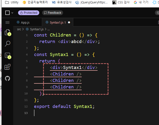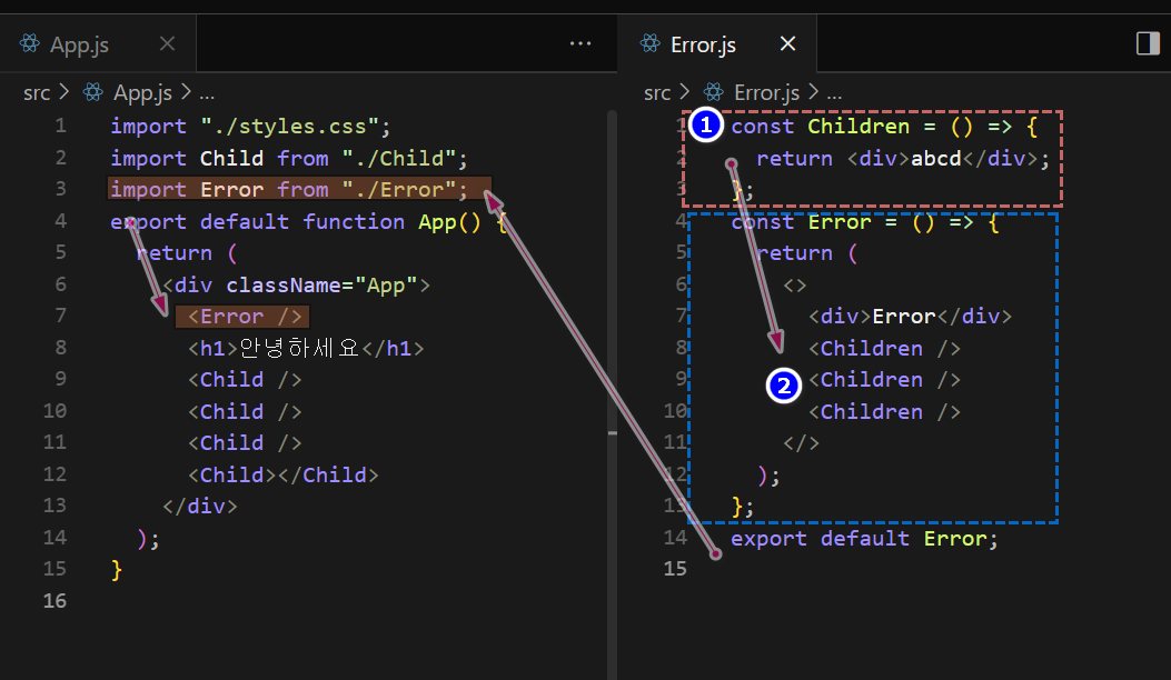 5function App() {6 return (7 <div>8 <h1>안녕하세요</h1>9 <Child />10 <Child />11 <Child />12 <Child></Child>13 </div>14 );15}16