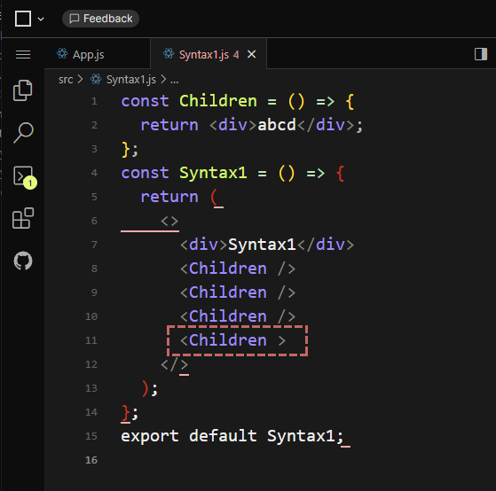<컴포넌트명 />싱글❤ **html 과 차이점은 단일태그 뒤에/기호가 없으면 오류가 발생합니다. ** 오류가 뜹니다