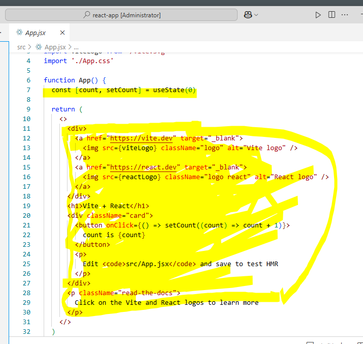 - App.tsx 코드 추가수정→표시된 부분 삭제 하고 코드작성