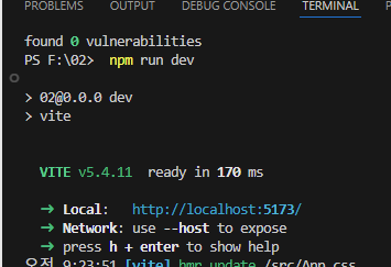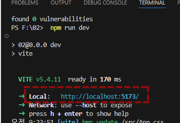 - 터미널에 응답이 출력되면서 local 주소가 확인되면 브라우저 주소창에 해당 링크로 이동하여 렌더링 결과를 확인한다.
