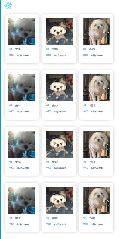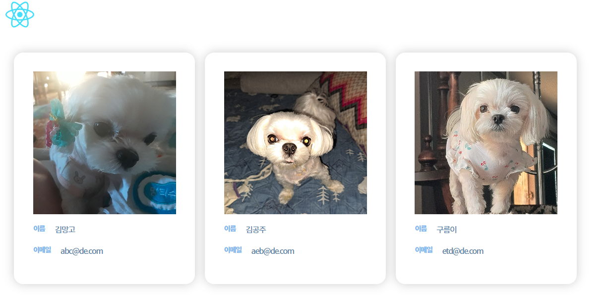 1//MemberItem.js2import "./MemberItem.css";3const MemberItem = () => {4 const member = {5 img: [6 "http://qwerew.cafe24.com/images/pet-1.jpg",7 "http://qwerew.cafe24.com/images/pet-2.jpg",8 "http://qwerew.cafe24.com/images/pet-3.jpg",9 ],10 name: ["김망고", "김공주", "구름이"],11 email: ["abc@de.com", "aeb@de.com", "etd@de.com"],12 };13