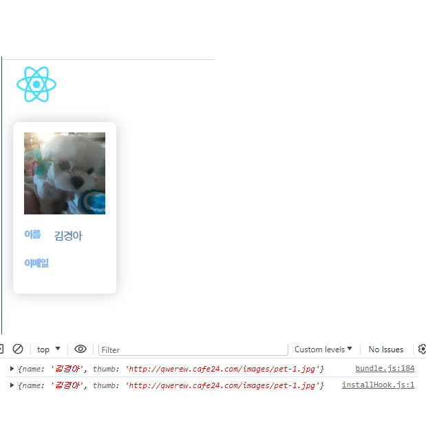 - 콘솔로그를 보면 App 에서 전달하고 있는 데이터가 확인됩니다.