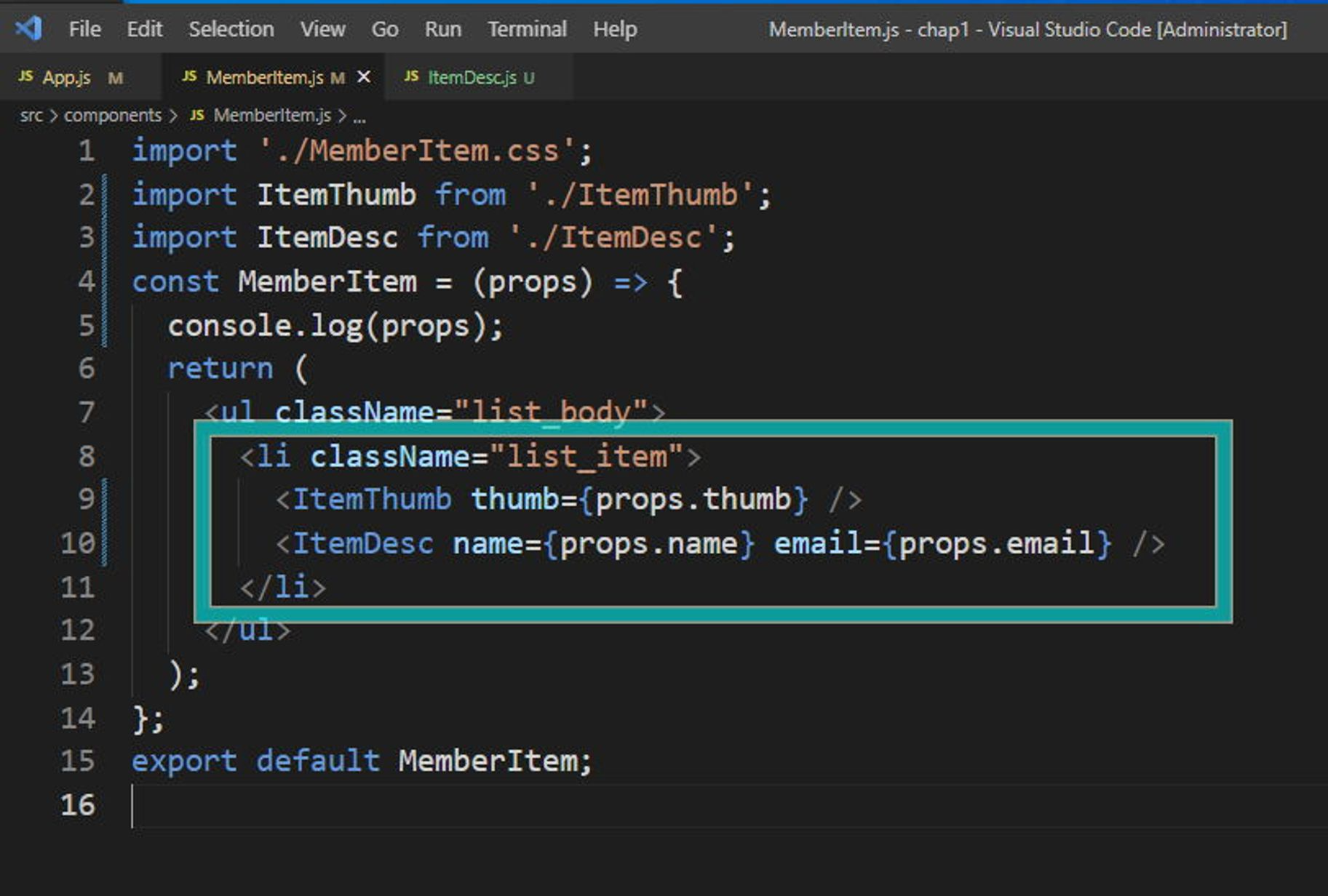 components/ItemDesc.js를 생성하고 함수형 컴포넌트로 만듭니다. 이때 매개변수에 props 를 작성합니다.components/MemberItem.js에서 설명을 표시하는 코드를 잘라 붙입니다.components/MemberItem.css에서 설명을 표시하는 css를 잘라 붙입니다.