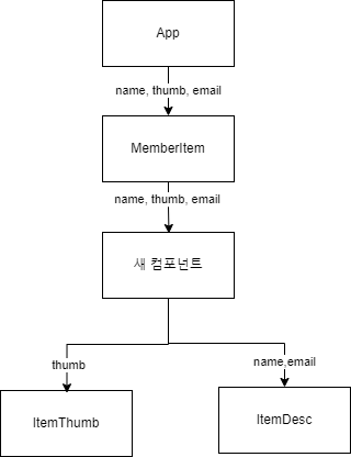 App에서 전달받은 데이터는 MemberItem 컴포넌트에서 각각 자식 컴포넌트로 나누어 전달하게 됩니다.