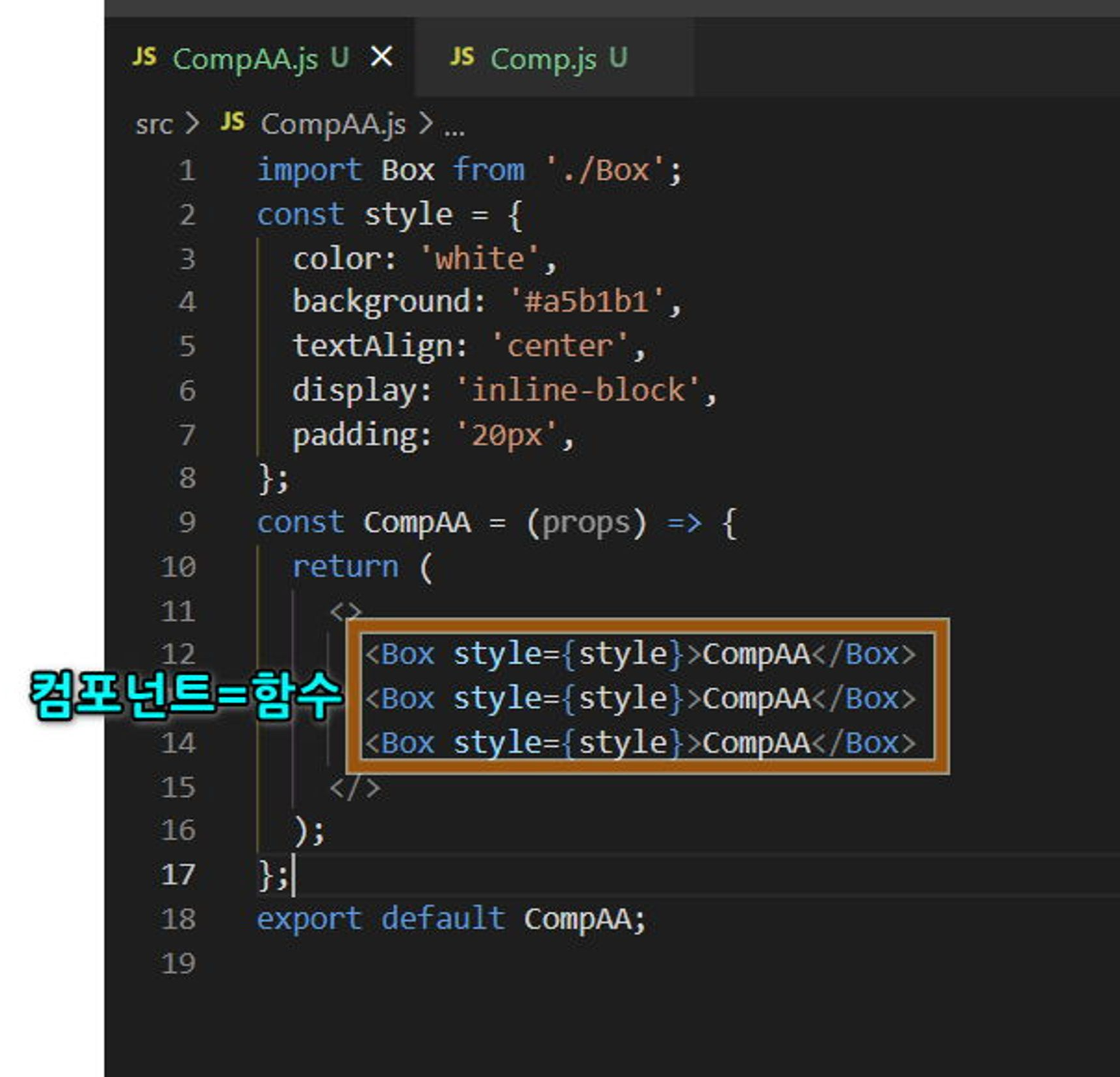 1const style = {2 marginTop: '20px',3 borderRadius: '20px',4 textAlign: 'center',5 padding: '20px',6 color: 'white',7};8const Box = (props) => {9 return <div style={style}></div>;10};11export default Box;3.2.2. src\CompAA.js