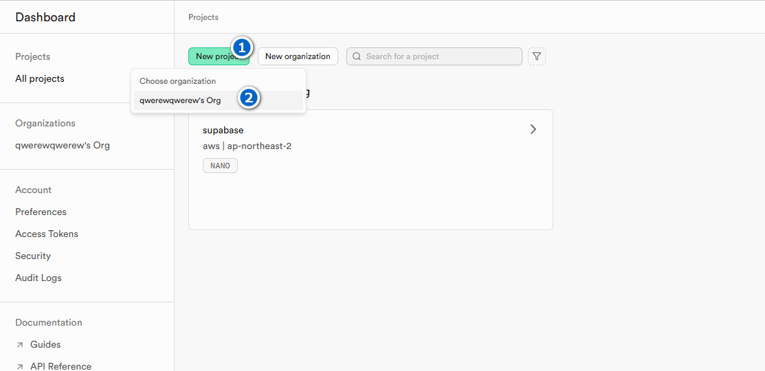 1[Account]2 └── [Organization 1]3 │ └── [Project 1]- Database, API, Auth, Storage, Realtime4 │ └── [Project 2]- Database, API, Auth, Storage, Realtime5 └── [Organization 2]6 └── [Project 3]- Database, API, Auth, Storage, Realtime계정[Account] 하위의 여러 조직[Organization]을 생성할수 있으며 각 조직별 프로젝트를 생성하여 독립적인 데이터베이스 시스템을 구축할수 있습니다.