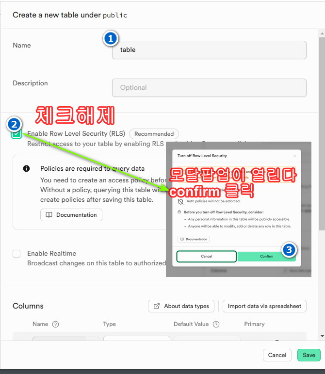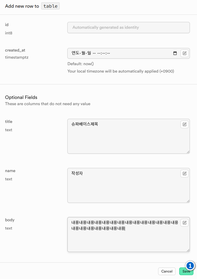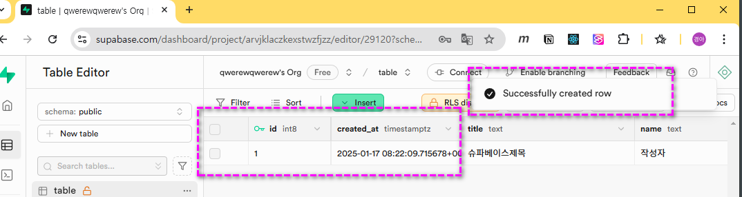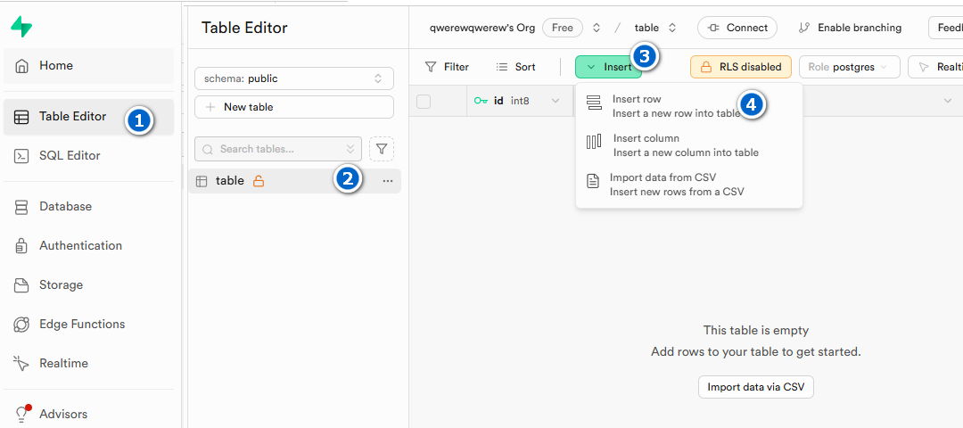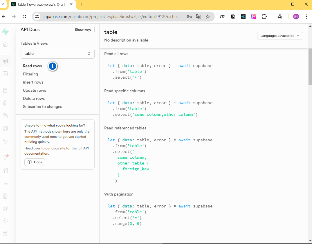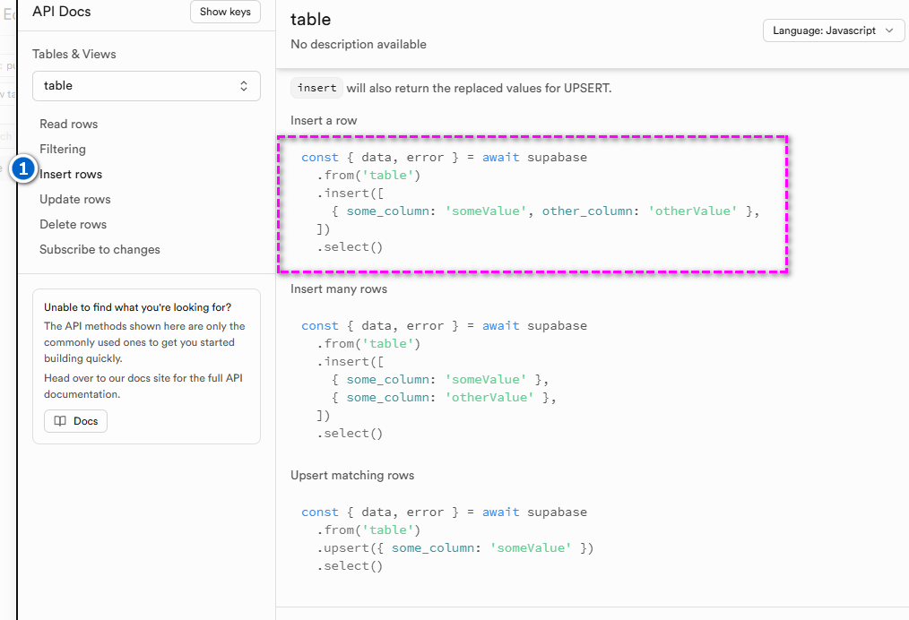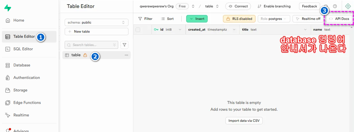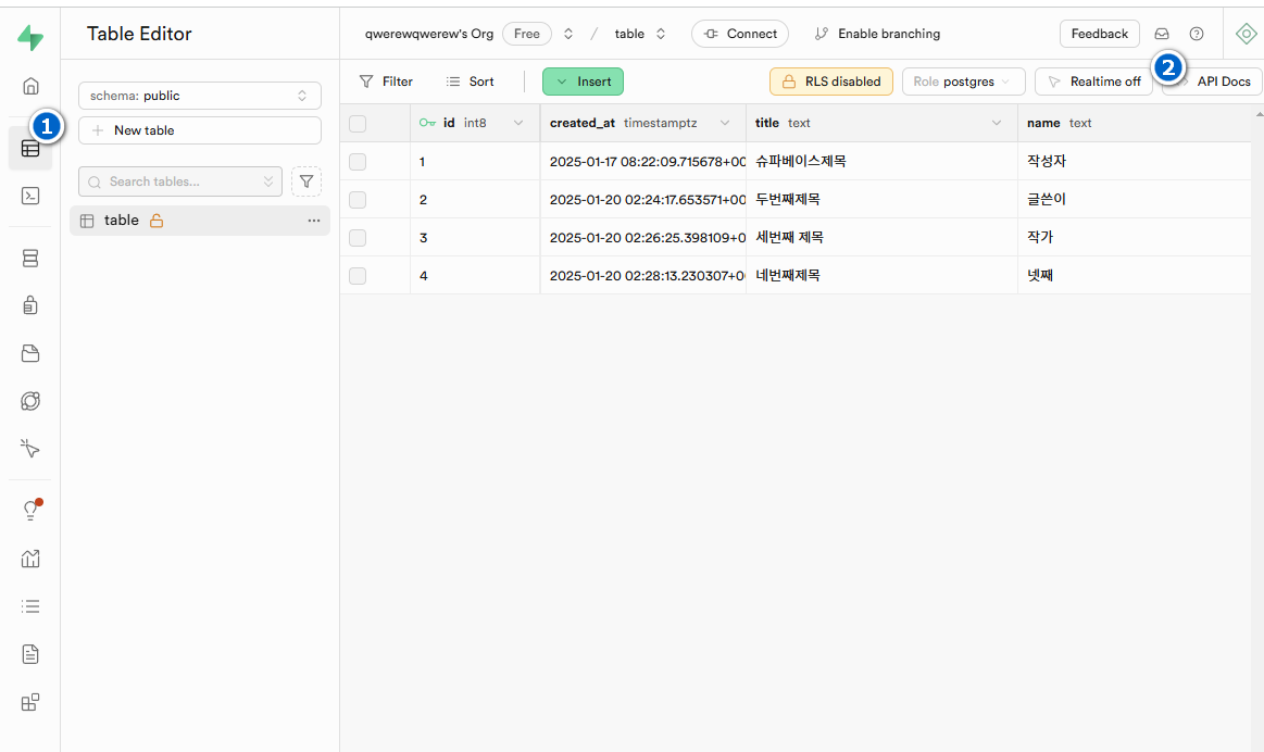 1const addForm = document.querySelector('#addForm');2addForm.addEventListener('submit', async (e) => {3 e.preventDefault();4 const title = document.querySelector('#title').value;5 const body = document.querySelector('#body').value;6 const name = document.querySelector('#name').value;7 const { data, error } = await client.from('table').insert([{ title, body, name }]);8 loadDB();9 document.querySelector('#title').value = '';10 document.querySelector('#body').value = '';11 document.querySelector('#name').value = '';12 if (error) {13 console.error(error);14 return;15 }16 });레코드(rows)를 추가하는 방법은 아래 이미지의 번호대로 이동하여 슈파베이스의 api 문서를 참조한다.