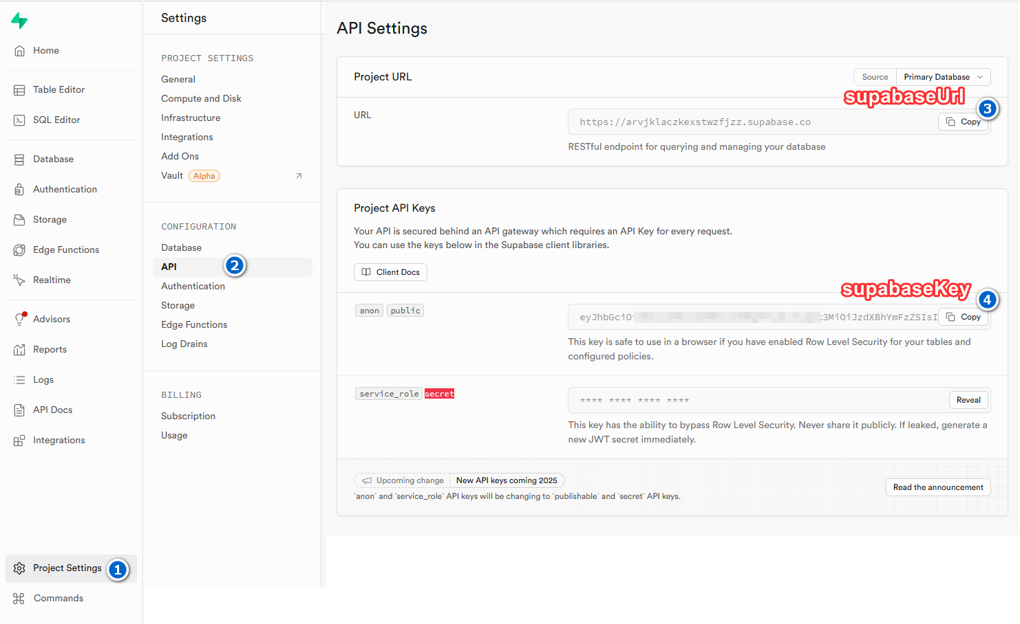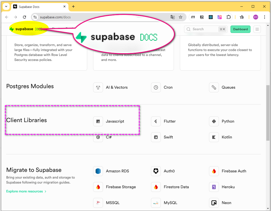 18</html>- 데이터베이스의 url 과 인증키를 추가하여 연결한다. https://supabase.com/docs/reference/javascript/initializing 참조 url과 key 확인은 아래 이미지를 참조하여 확인한다.