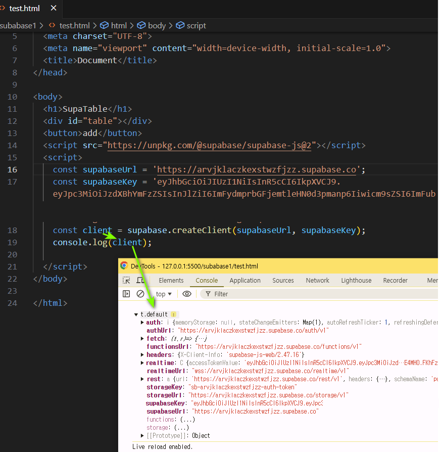 1 <script src="https://unpkg.com/@supabase/supabase-js@2"></script>2 <script>3 const supabaseUrl = 'https://arvjklaczkexstwzfjzz.supabase.co';4 const supabaseKey = 'eyJhbGciOiJIUzI1NiIsInR5어쩌구저쩌구'5 </script>createClient()method를 호출하여 url과 key 를 전달하면 연결된다.