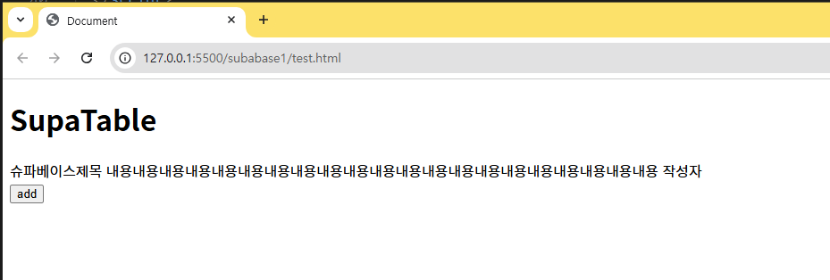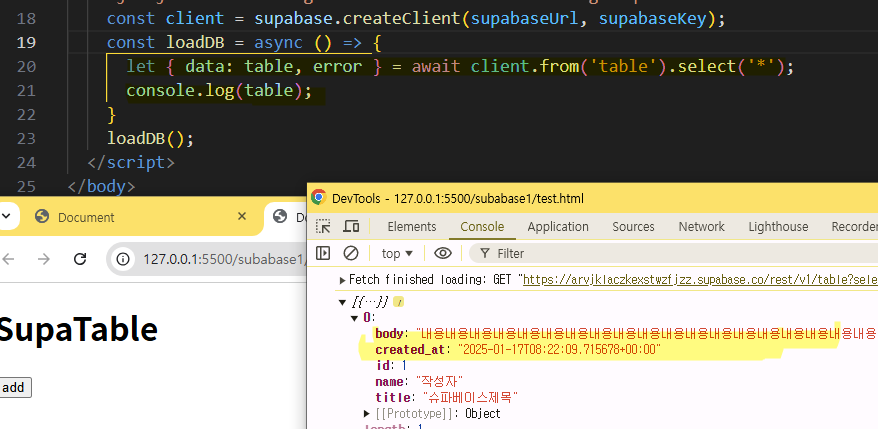 5const loadDB = async () => {6 let { data: table, error } = await client.from('table').select('*');7 if (error) {8 console.error(error);9 return;10 }11 //동적요소를 담을 변수12 let el = '';13 //for 문으로 table의 길이만큼 동적요소 생성14 for (let i = 0; i < table.length; i++) {15 el += `<div>${table[i].title} ${table[i].body} ${table[i].name}</div>`;16 }17 //tableEl에 동적요소 삽입18 tableEl.innerHTML = el;19}20loadDB();
