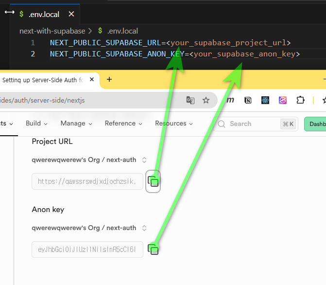 1NEXT_PUBLIC_SUPABASE_URL=<your_supabase_project_url>2NEXT_PUBLIC_SUPABASE_ANON_KEY=<your_supabase_anon_key>각 변수의 값은 가이드 문서에서 확인할 수 있다.