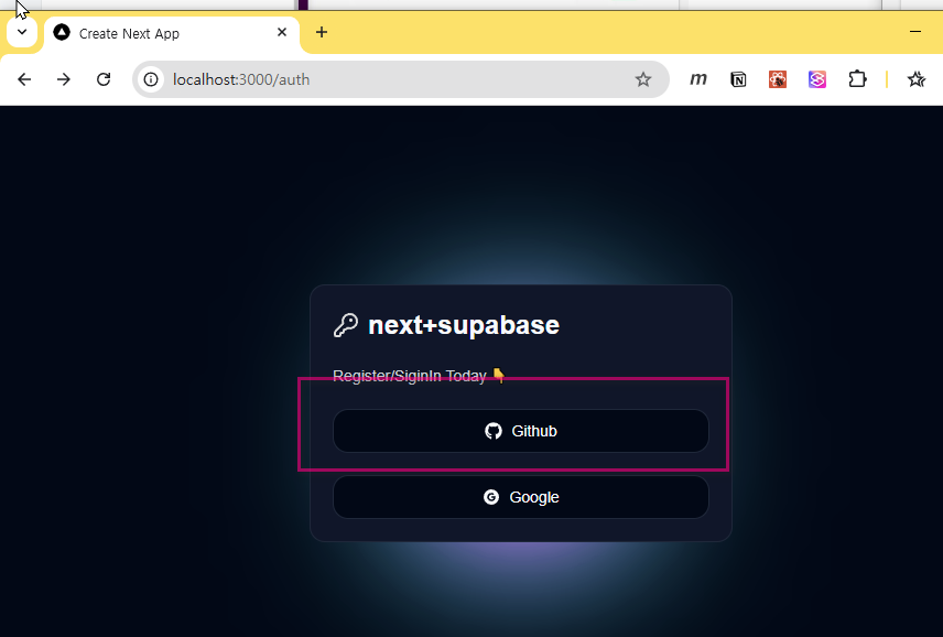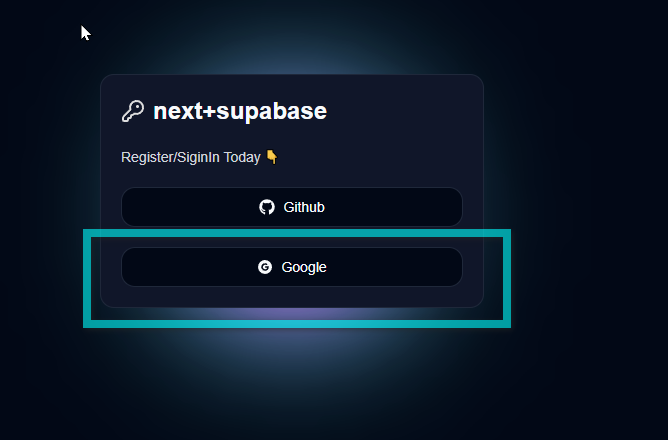 9const Page = () => {10** const handleLoginWithOAuth = (provider: 'github' | 'google') => {11 const supabase = createClient();12 supabase.auth.signInWithOAuth({13 provider,14 options: {15 redirectTo: `${window.location.origin}/auth/callback`,16 },17 });18 };**19 return (20 <div className="flex items-center justify-center w-full h-screen">21 <div className="w-96 rounded-md border p-5 space-y-5 relative bg-slate-900">22 <div className="flex items-center gap-2">23 <KeyRound color="#dedede" />24 <h1 className="text-2xl font-bold">next+supabase</h1>25 </div>26 <p className="text-sm text-gray-300">Register/SiginIn Today 👇</p>27