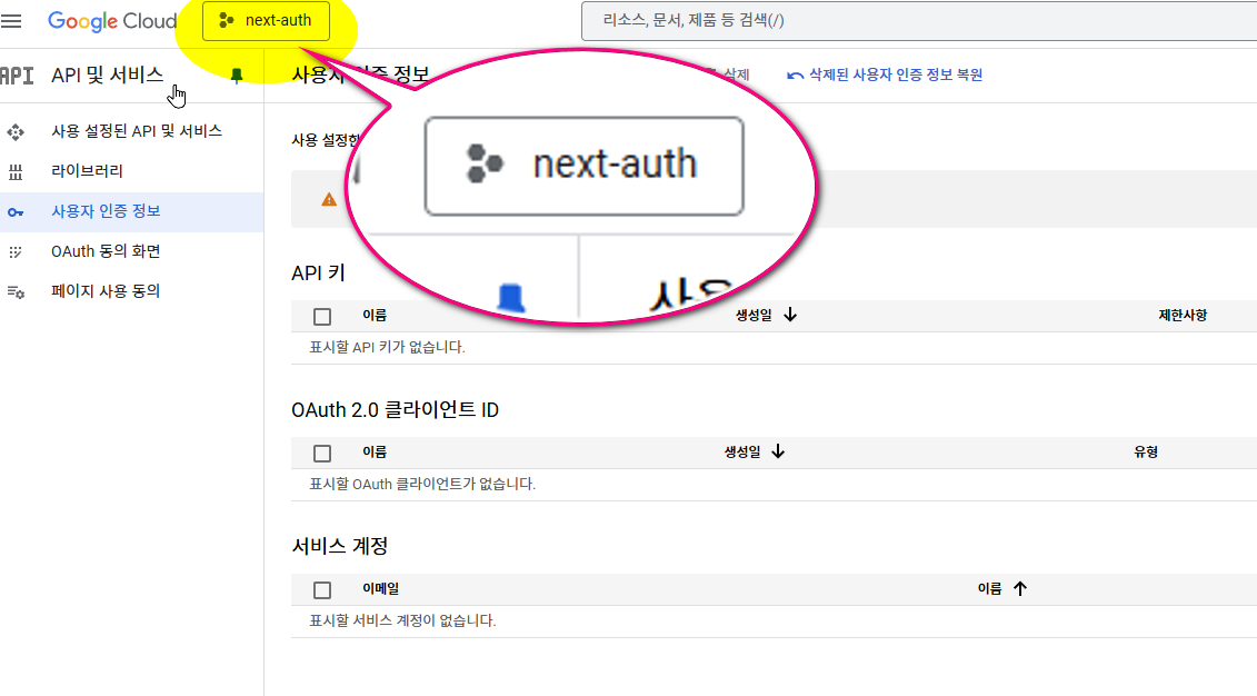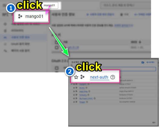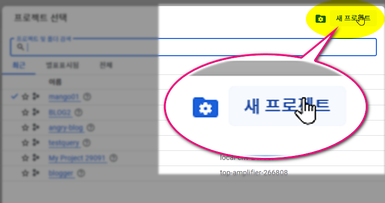 - 대시보드에서 화면 상단의 프로젝트 버튼을 클릭하여 생성한 프로젝트를 선택한다.
