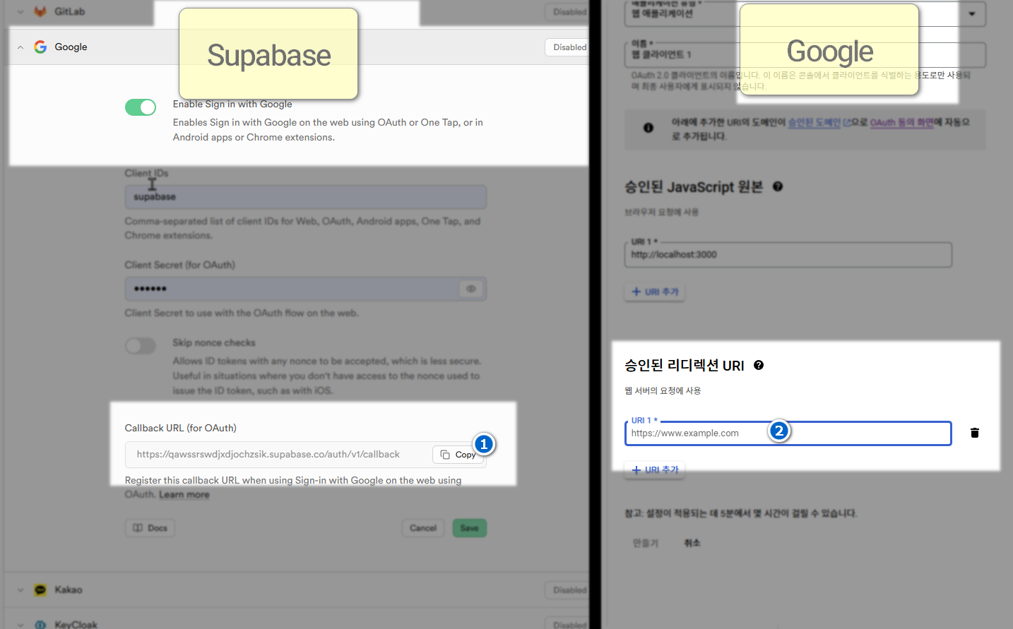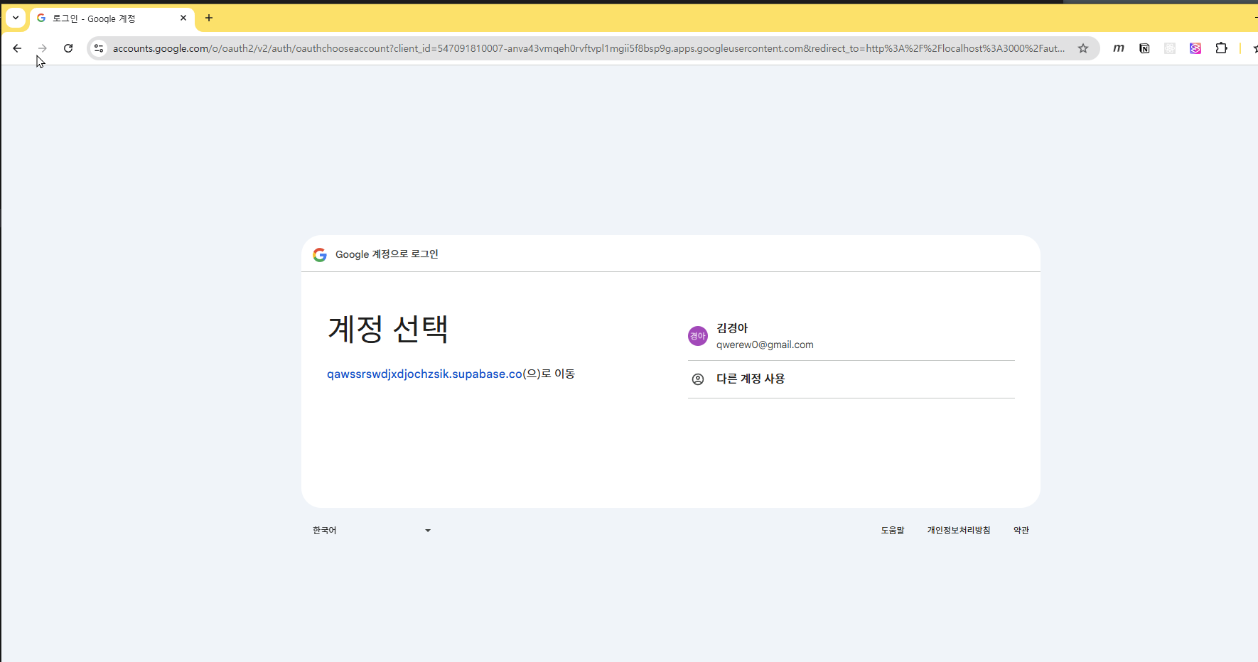 - 리디렉션 url 은 수파베이스의 Authentication 으로 이동하여 복사한다.