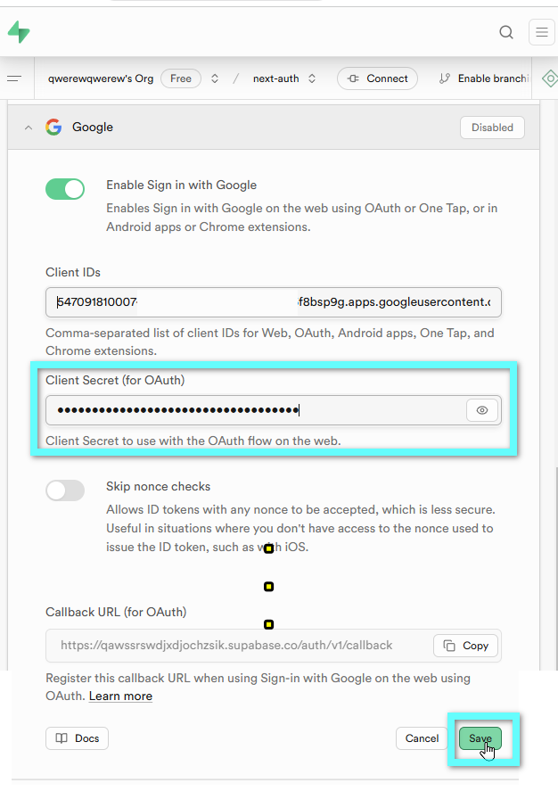 - 수파베이스에 붙여넣기 다른 것은 비워놓고 저장 클릭