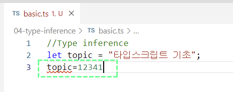 1//Type inference2let topic = "타입스크립트 기초";3let topic1: string = "타입스크립트 기초";4topic=1234