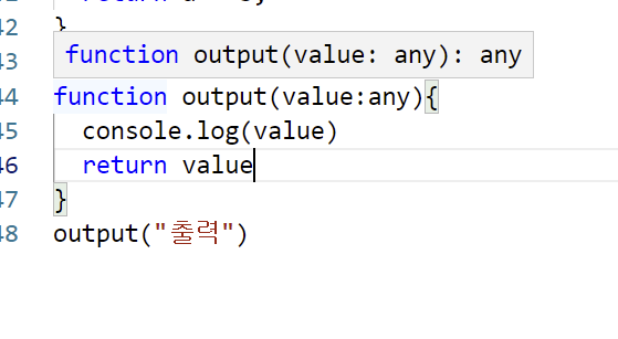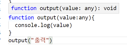 1function output(value:any){2 console.log(value)3}4output("출력")