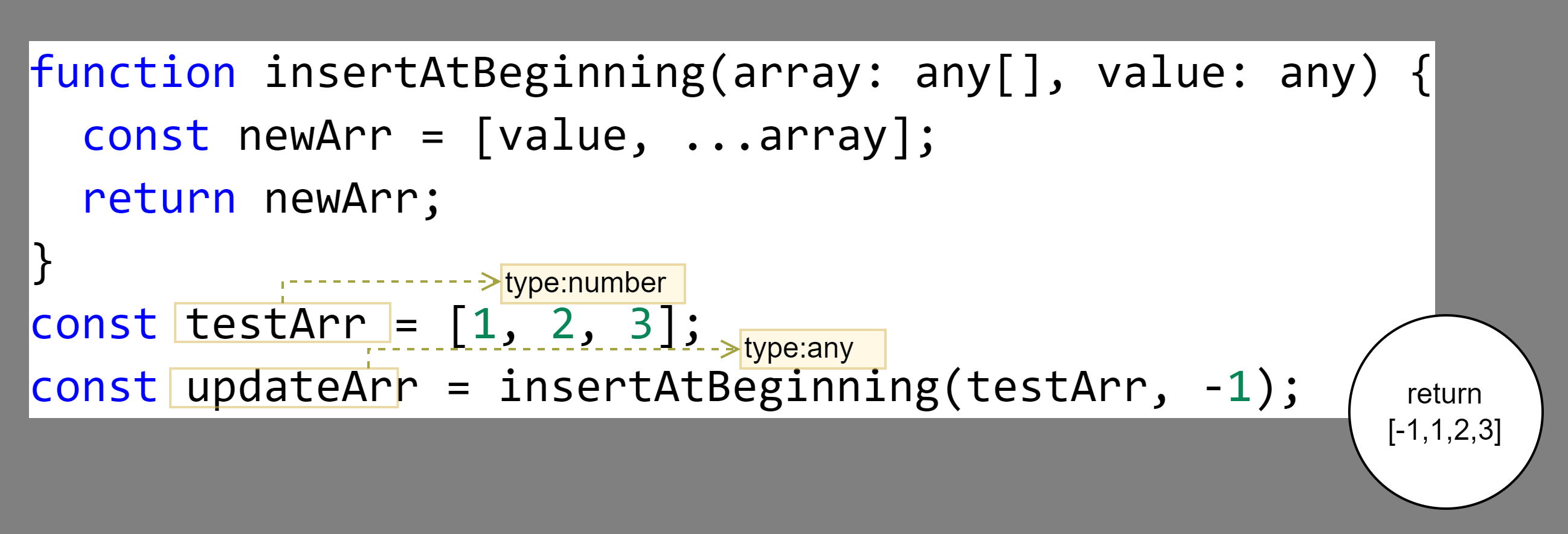 - typescript 는 insertAtBeginning 함수 내 매개변수의 배열은 any 타입으로 추론하며 하위 모든 객체, 값은 any타입으로 생각하게 된다.