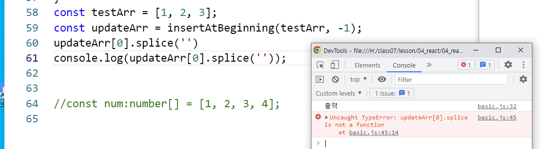 1function insertAtBeginning<T>(array: T[], value: T) {2 const newArr = [value, ...array];3 return newArr;4}5const testArr = [1, 2, 3];6const updateArr = insertAtBeginning(testArr, -1);7updateArr[0].splice("");//updateArr에는 number 가 있으므로 오류8console.log(updateArr[0].splice(""));- 문자자료형을 전달해보자