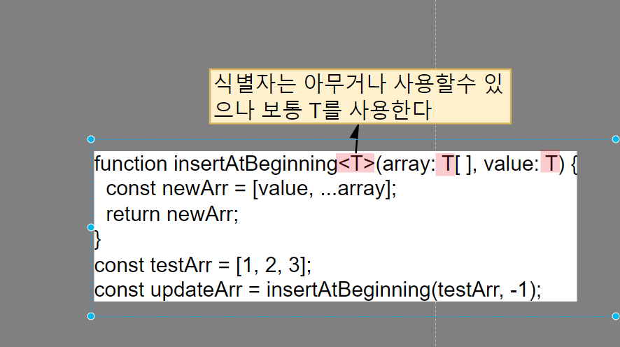 1const stringArr = insertAtBeginning(["a", "b"], "c");2stringArr[0].split("");3console.log(stringArr[0].split(""));b. generic type 으로 지정된 매개변수는 전달된 값의 타입에 따라 추론된다.