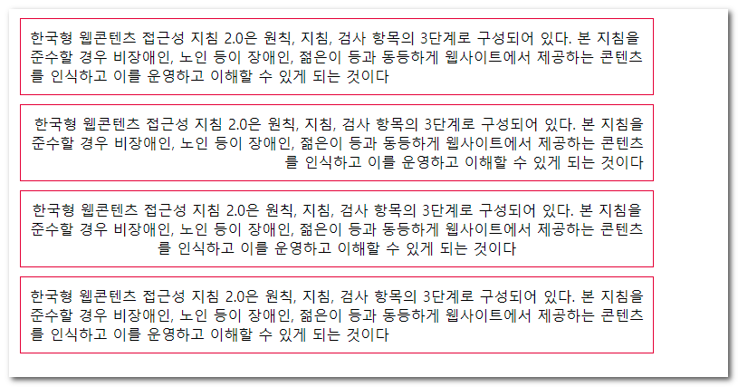 <p class="txt1">한국형 웹콘텐츠 접근성 지침 2.0은 원칙, 지침, 검사 항목의 3단계로 구성되어 있다. 본 지침을 준수할 경우 비장애인, 노인 등이 장애인, 젊은이 등과 동등하게 웹사이트에서 제공하는 콘텐츠를 인식하고 이를 운영하고 이해할 수 있게 되는 것이다</p>