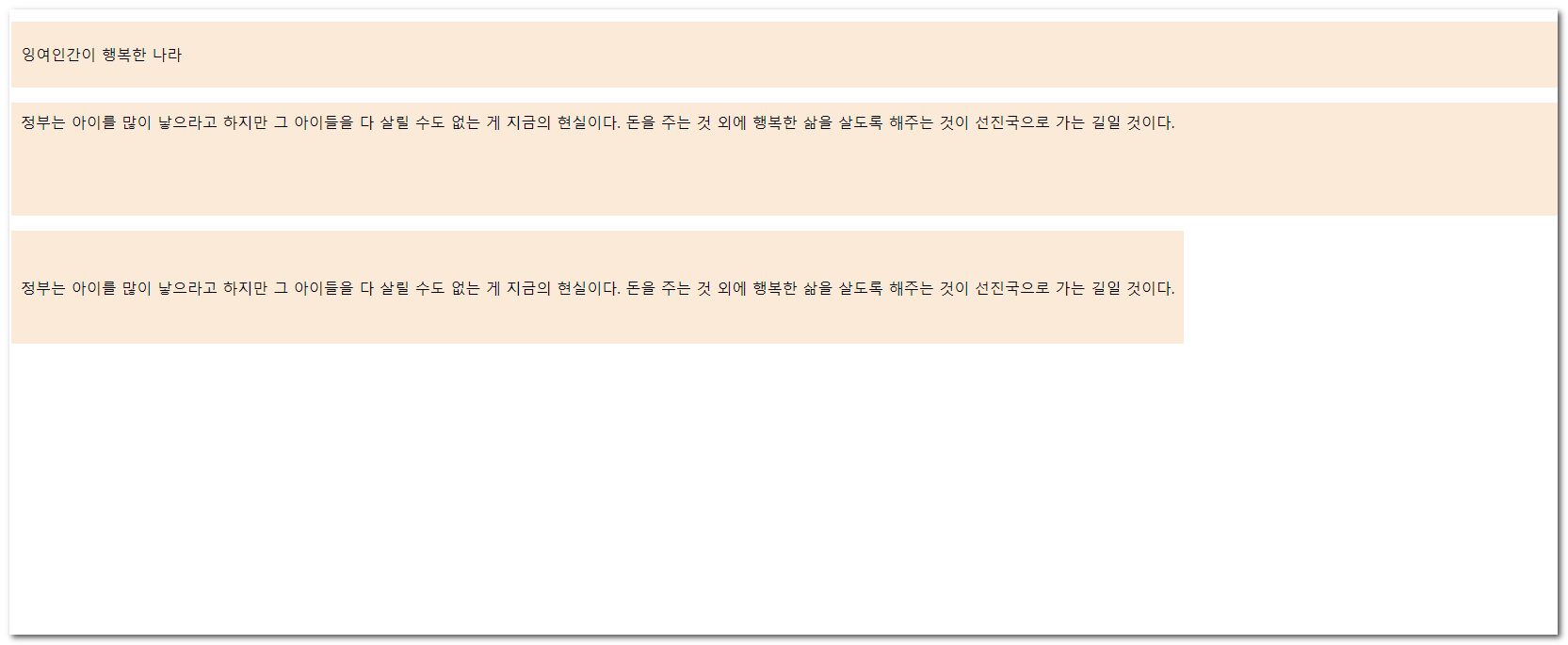<p class="valign3">정부는 아이를 많이 낳으라고 하지만 그 아이들을 다 살릴 수도 없는 게 지금의 현실이다. 돈을 주는 것 외에 행복한 삶을 살도록 해주는 것이 선진국으로 가는 길일 것이다.</p>
