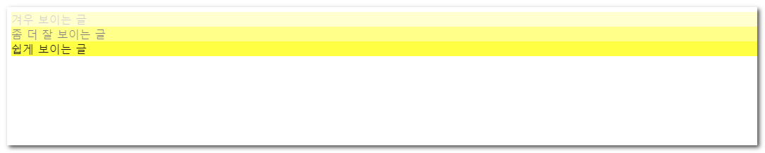 8</style>9</head>10<body>11 <div class="light">겨우 보이는 글</div>12 <div class="medium">좀 더 잘 보이는 글</div>13 <div class="heavy">쉽게 보이는 글</div>14</body>15</html>1<!DOCTYPE html>2<html lang="ko">3 <head>4 <meta charset="UTF-8" />5 <meta http-equiv="X-UA-Compatible" content="IE=edge" />6 <meta name="viewport" content="width=device-width, initial-scale=1.0" />7 <title>Document</title>8 </head>9 <body>10 <!DOCTYPE html>11 <html lang="ko">12 <head>13 <meta charset="utf-8" />14 <title>opacity</title>15 <style type="text/css">16 body {17 background-image: url(img/bg_grid.gif);18 }19 div {20 background-color: yellow;21 }22 .light {23 opacity: 0.2;24 }25 .medium {26 background-color: rgba(255,255,0,0.2);27 }28 .heavy {29 opacity: 0.9;30 }31 </style>32 </head>33 <body>34 <div class="light">겨우 보이는 글</div>35 <div class="medium">좀 더 잘 보이는 글</div>36 <div class="heavy">쉽게 보이는 글</div>37 </body>38 </html>39 </body>40</html>02. background