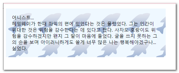 8</style>9</head>10<body>11 <p>12 어니스트... <br>13 헤밍웨이가 한때 좌익의 편에 있었다는 것은 몰랐었다. 그는 인간이 위대한 것은 위험을 감수한다는 데 있다고 했다. 사자도 호랑이도 위험을 감수하겠지만 왠지 그 말이 마음에 들었다. 글을 쓰지 못하는 그의 손을 보며 아이러니하게도 쓸게 너무 많은 나는 행복해야겠구나... 싶었다.14 </p>15</body>16</html>1<!DOCTYPE html>2<html lang="ko">3 <head>4 <meta charset="utf-8" />5 <title>배경이미지</title>6 <style type="text/css">7 p {8 width:500px;9 padding:20px;10 background-color: aliceblue;11 background-image: url('img/bgimg.png');12 }13 </style>14 </head>15 <body>16 <p>17 어니스트... <br />18 헤밍웨이가 한때 좌익의 편에 있었다는 것은 몰랐었다. 그는 인간이 위대한19 것은 위험을 감수한다는 데 있다고 했다. 사자도 호랑이도 위험을 감수하겠지만20 왠지 그 말이 마음에 들었다. 글을 쓰지 못하는 그의 손을 보며 아이러니하게도21 쓸게 너무 많은 나는 행복해야겠구나... 싶었다.22 </p>23 <p></p>24 </body>25</html>② background-repeat
