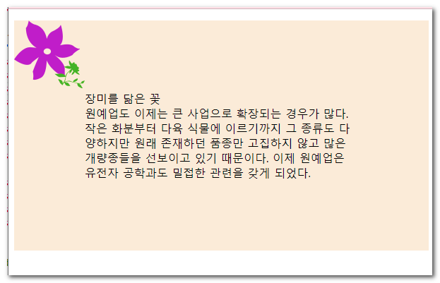 8</style>9</head>10<body>11 <p>12 장미를 닮은 꽃<br>13 원예업도 이제는 큰 사업으로 확장되는 경우가 많다. 작은 화분부터 다육 식물에 이르기까지 그 종류도 다양하지만 원래 존재하던 품종만 고집하지 않고 많은 개량종들을 선보이고 있기 때문이다. 이제 원예업은 유전자 공학과도 밀접한 관련을 갖게 되었다.14 </p>15</body>16</html>1<!DOCTYPE html>2<html lang="ko">3 <head>4 <meta charset="utf-8" />5 <title>배경이미지의 반복여부</title>6 <style type="text/css">7 p {8 padding:100px;9 background-color: antiquewhite;10 background-image: url(img/bg_flower.png);11 background-repeat: no-repeat;12 }13 </style>14 </head>15 <body>16 <p>17 장미를 닮은 꽃<br />김경아 원예업도 이제는 큰 사업으로 확장되는 경우가18 많다. 작은 화분부터 다육 식물에 이르기까지 그 종류도 다양하지만 원래19 존재하던 품종만 고집하지 않고 많은 개량종들을 선보이고 있기 때문이다. 이제20 원예업은 유전자 공학과도 밀접한 관련을 갖게 되었다.21 </p>22 </body>23</html>③ background-position