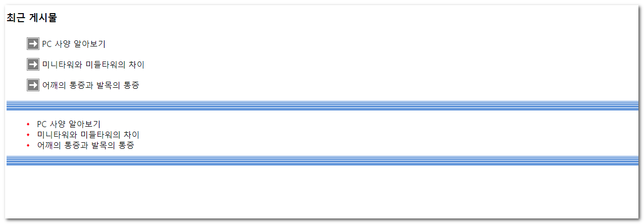 8</style>9</head>10<body>11 <h3>최근 게시물</h3>12 <ul>13 <li>PC 사양 알아보기</li>14 <li>미니타워와 미들타워의 차이</li>15 <li>어깨의 통증과 발목의 통증</li>16 </ul>17 <ul>18 <li>PC 사양 알아보기</li>19 <li>미니타워와 미들타워의 차이</li>20 <li>어깨의 통증과 발목의 통증</li>21 </ul>22</body>23</html>1<!DOCTYPE html>2<html lang="ko">3