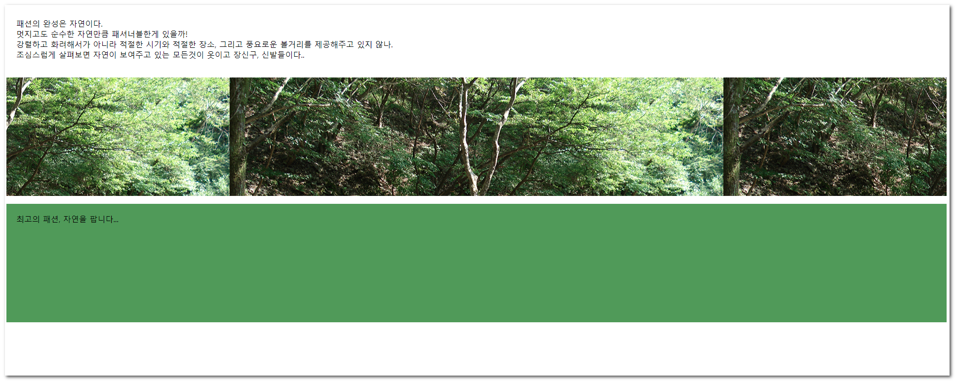 8</style>9</head>10<body>11 <p>패션의 완성은 자연이다.<br>멋지고도 순수한 자연만큼 패셔너블한게 있을까! <br>강렬하고 화려해서가 아니라 적절한 시기와 적절한 장소, 그리고 풍요로운 볼거리를 제공해주고 있지 않나.<br>12 조심스럽게 살펴보면 자연이 보여주고 있는 모든것이 옷이고 장신구, 신발들이다..</p>13 <p class="bg_fixed"></p>14 <p class="btm">최고의 패션, 자연을 팝니다... </p>15</body>16</html>1<!DOCTYPE html>2<html lang="ko">3<head>4<meta charset="utf-8">5<title>배경이미지 고정</title>6<style type="text/css">7 p { padding: 20px; }8 .bg_fixed {9 min-height: 200px;10 background-image: url(img/bg_fixed.png);11 background-position: center;12 background-attachment:fixed;13 }14 .btm {15 min-height:200px;16 background: #595;17 }18</style>19</head>20<body>21 <p>패션의 완성은 자연이다.<br>멋지고도 순수한 자연만큼 패셔너블한게 있을까! <br>강렬하고 화려해서가 아니라 적절한 시기와 적절한 장소, 그리고 풍요로운 볼거리를 제공해주고 있지 않나.<br>22 조심스럽게 살펴보면 자연이 보여주고 있는 모든것이 옷이고 장신구, 신발들이다..</p>23 <p class="bg_fixed"></p>24 <p class="btm">최고의 패션, 자연을 팝니다... </p>25</body>26</html>⑤ background-size
