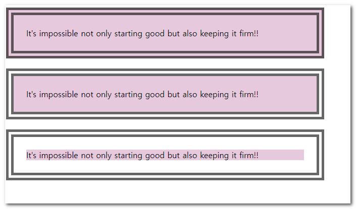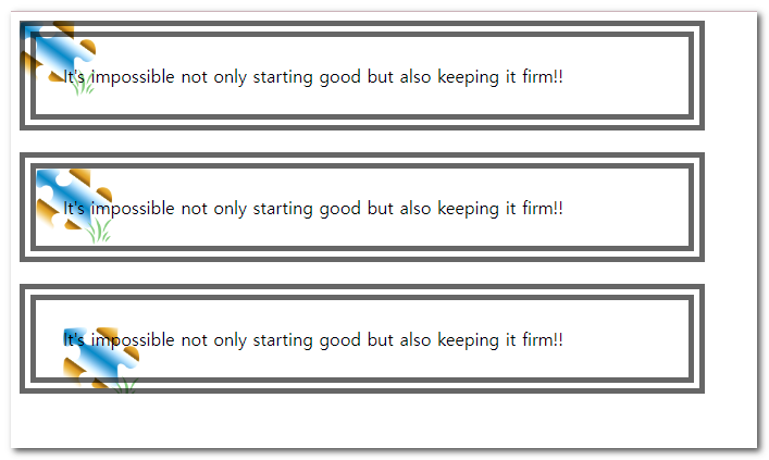 8</style>9</head>10<body>11 <div class="ori1">It's impossible not only starting good but also keeping it firm!!</div>12 <div class="ori2">It's impossible not only starting good but also keeping it firm!!</div>13 <div class="ori3">It's impossible not only starting good but also keeping it firm!!</div>14</body>15</html>1<!DOCTYPE html>2<html lang="ko">3 <head>4 <meta charset="utf-8" />5 <title>배경이미지의 원점</title>6 <style type="text/css">7 div{8 width:550px;9 padding:25px;10 margin-bottom: 20px;11 border:15px double rgba(0,0,0,.6);12 background: url('img/bg_origin.png') no-repeat ;13 background-size: 70px;14 }15 .ori1{background-origin: border-box;}16 .ori2{background-origin: padding-box;}17 .ori3{background-origin: content-box;}18 </style>19 </head>20 <body>21 <div class="ori1">22 It's impossible not only starting good but also keeping it firm!!23 </div>24 <div class="ori2">25 It's impossible not only starting good but also keeping it firm!!26 </div>27 <div class="ori3">28 It's impossible not only starting good but also keeping it firm!!29 </div>30 </body>31</html>⑥ background-clip
