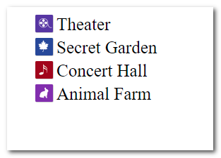 8</style>9</head>10<body>11 <ul class="lnb">12 <li><a href="#">Theater</a></li>13 <li><a href="#">Secret Garden</a></li>14 <li><a href="#">Concert Hall</a></li>15 <li><a href="#">Animal Farm</a></li>16 </ul>17</body>18</html>1<!DOCTYPE html>2<html lang="ko">3 <head>4 <meta charset="utf-8" />5 <title>IMAGE SPRITE</title>6 <style type="text/css">7 li {8 list-style: none;9 margin:5px;10 }11 li a {12 text-decoration: none;13 font-family: "Times New Roman", Times, serif;14 color:#333;15 display: block;16 padding-left:30px;17 background: #999;18 background: url('img/bg_sprite.png') no-repeat;19 background-size: 26px;20 font-size: 25px;21 }22 .lnb li:nth-child(1) a{background-position: 0 0;}23 .lnb li:nth-child(2) a{background-position: 0 -50px;}24 .lnb li:nth-child(3) a{background-position: 0 -100px;}25 .lnb li:nth-child(4) a{background-position: 0 -150px;}26 </style>27 </head>28 <body>29 <ul class="lnb">30 <li><a href="#">Theater</a></li>31 <li><a href="#">Secret Garden</a></li>32 <li><a href="#">Concert Hall</a></li>33 <li><a href="#">Animal Farm</a></li>34 </ul>35 </body>36</html>04. gradient