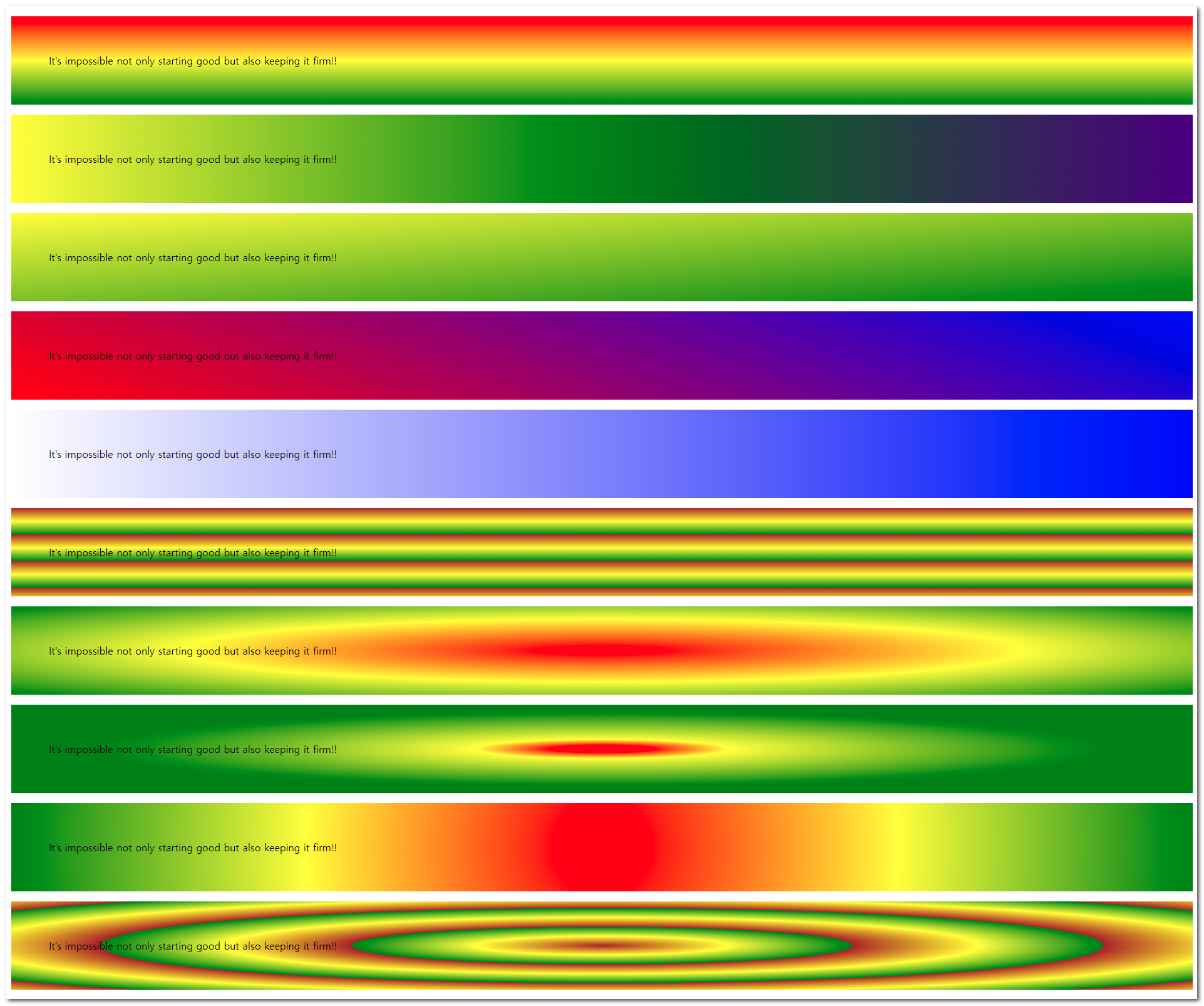 9</style>10</head>11<body>12 <p class="g1">It's impossible not only starting good but also keeping it firm!!</p>13 <p class="g2">It's impossible not only starting good but also keeping it firm!!</p>14 <p class="g3">It's impossible not only starting good but also keeping it firm!!</p>15 <p class="g4">It's impossible not only starting good but also keeping it firm!!</p>16 <p class="g5">It's impossible not only starting good but also keeping it firm!!</p>17 <p class="g6">It's impossible not only starting good but also keeping it firm!!</p>18 <p class="g7">It's impossible not only starting good but also keeping it firm!!</p>19 <p class="g8">It's impossible not only starting good but also keeping it firm!!</p>20 <p class="g9">It's impossible not only starting good but also keeping it firm!!</p>21 <p class="g10">It's impossible not only starting good but also keeping it firm!!</p>22</body>23</html>1<!DOCTYPE html>2<html lang="ko">3 <head>4 <meta charset="utf-8" />5 <title>gradient의 표현</title>6 <style type="text/css">7 p {8 padding: 60px;9 }10 .g1 {11 background: red;12 background: linear-gradient(red, yellow, green);13 }14 .g2 {15 background: linear-gradient(to right, red, yellow, purple, green);16 }17 .g3 {18 background: linear-gradient(to bottom right, red, yellow, green);19 }20 .g4 {21 background: linear-gradient(-200deg, red, yellow, green);22 }23 .g5 {24 background: linear-gradient(25 to right,26 rgba(0, 0, 255, 0),27 rgba(0, 0, 255, 0.8)28 );29 }30 .g6 {31 background: repeating-linear-gradient(brown, yellow 15%, green 30%);32 }33 .g7 {34 background: radial-gradient(red, yellow, green);35 }36 .g8 {37 background: radial-gradient(red 5%, yellow 15%, green 60%);38 background: radial-gradient(39 closest-side at 35% 35%,40 red 5%,41 yellow 15%,42 green 60%43 );44 }45 .g9 {46 background: radial-gradient(47 circle,48 red,49 rgba(0, 0, 255, 0),50 rgba(0, 0, 255, 0.8)51 );52 }53 .g10 {54 /* colorzilla generator */55 background: #e52d77;56 /* vendor prefix57 실험적인 기술을 브라우저에서 사용하기 위한 접두어58 -webkit- : 크롬, 사파리 , 엣지59 -o- : 오페라60 -moz- : 파이어폭스61 -ms- : 익스62 */63 background: -moz-linear-gradient(64 left,65 #e52d77 0%,66 #6b4711 30%,67 #28d330 51%,68 #e82559 61%,69 #c6976b 100%70 );71 background: -webkit-linear-gradient(72 left,73 #e52d77 0%,74 #6b4711 30%,75 #28d330 51%,76 #e82559 61%,77 #c6976b 100%78 );79 background: linear-gradient(80 to right,81 #e52d77 0%,82 #6b4711 30%,83 #28d330 51%,84 #e82559 61%,85 #c6976b 100%86 );87 filter: progid:DXImageTransform.Microsoft.gradient( startColorstr='#e52d77', endColorstr='#c6976b',GradientType=1 );88 }89 </style>90 </head>91 <body>92 <p class="g1">93 It's impossible not only starting good but also keeping it firm!!94 </p>95 <p class="g2">96 It's impossible not only starting good but also keeping it firm!!97 </p>98 <p class="g3">99 It's impossible not only starting good but also keeping it firm!!100 </p>101 <p class="g4">102 It's impossible not only starting good but also keeping it firm!!103 </p>104 <p class="g5">105 It's impossible not only starting good but also keeping it firm!!106 </p>107 <p class="g6">108 It's impossible not only starting good but also keeping it firm!!109 </p>110 <p class="g7">111 It's impossible not only starting good but also keeping it firm!!112 </p>113 <p class="g8">114 It's impossible not only starting good but also keeping it firm!!115 </p>116 <p class="g9">117 It's impossible not only starting good but also keeping it firm!!118 </p>119 <p class="g10">120 It's impossible not only starting good but also keeping it firm!!121 </p>122 </body>123</html>05. radial-gradient
