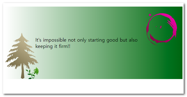 8</style>9</head>10<body>11 <p>It's impossible not only starting good but also keeping it firm!!</p>12</body>13</html>1<!DOCTYPE html>2<html lang="ko">3 <head>4 <meta charset="utf-8" />5 <title>다중 배경이미지</title>6 <style type="text/css">7 p {8 padding: 100px;9 background-image: url(img/bg_tree.png), url(img/bg_sun.png),10 linear-gradient(to right, rgba(0, 100, 0, 0), rgba(0, 100, 0, 1));11 background-repeat: no-repeat, repeat-y;12 background-position: bottom left, 90% 15%;13 }14 </style>15 </head>16 <body>17 <p>It's impossible not only starting good but also keeping it firm!!</p>18 </body>19</html>08. 형성퀴즈