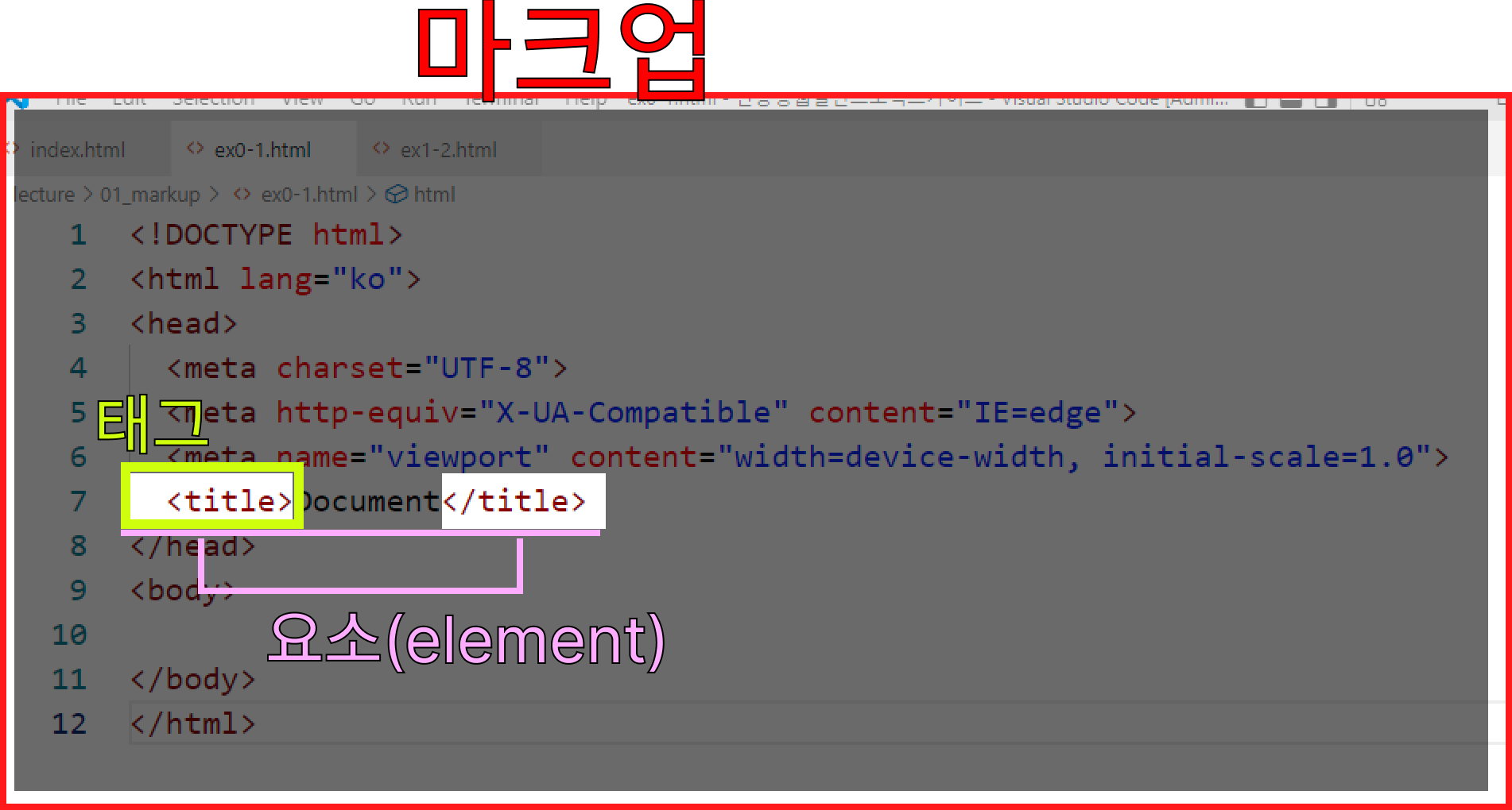 1<!DOCTYPE html>2<html lang="ko">3<head>4 <meta charset="UTF-8">5 <meta http-equiv="X-UA-Compatible" content="IE=edge">6 <meta name="viewport" content="width=device-width, initial-scale=1.0">7 <title>Document</title>8</head>9<body>10 ~~타이틀~~11 <h1>타이틀</h1>12</body>13</html>4-2 . 논리적 마크업