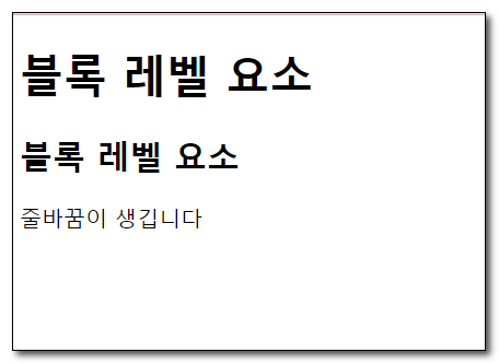 1<!DOCTYPE html>2<html lang="ko">3<head>4 <meta charset="UTF-8">5 <title>블록 레벨 요소</title>6</head>7<body>8 <h1>블록 레벨 요소</h1>9 <h2>블록 레벨 요소 성질</h2>10 <p>줄 바꿈이 생깁니다.</p>11</body>12</html>