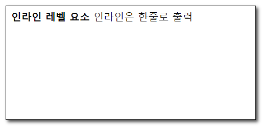 1<!DOCTYPE html>2<html lang="ko">3<head>4 <meta charset="UTF-8">5 <title>인라인 요소</title>6</head>7<body>8 <strong>인라인 요소</strong>9 <span>인라인 요소는 한 줄로 출력됩니다.</span>10</body>11</html>