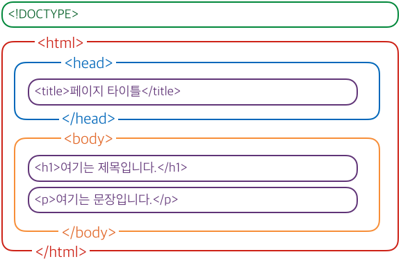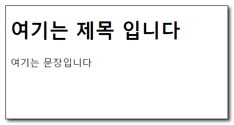 1<!DOCTYPE html>2<html lang="en">3<head>4 <meta charset="UTF-8">5 <meta http-equiv="X-UA-Compatible" content="IE=edge">6 <meta name="viewport" content="width=device-width, initial-scale=1.0">7 <title>페이지타이틀</title>8</head>9<body>10 <h1>여기는 제목 입니다</h1>11 <p>여기는 문장입니다</p>12</body>13</html>정보