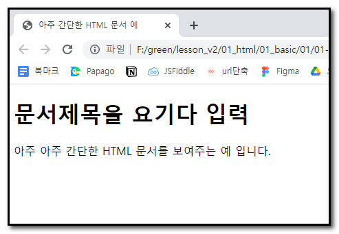 1<!DOCTYPE html>2<html>3<head>4 <meta http-equiv="X-UA-Compatible" content="IE=edge">5 <meta charset="UTF-8">6 <title>아주 간단한 HTML 문서 예</title>7</head>8<body>9 <h1>문서제목을 요기다 입력</h1>10 <p>아주 아주 간단한 HTML 문서를 보여주는 예 입니다.</p>11</body>12</html>03. 제목 요소