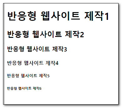 1<!DOCTYPE html>2<html lang="ko">3<head>4 <meta charset="UTF-8">5 <title>제목 요소</title>6</head>7<body>8 <h1>반응형 웹사이트 제작1</h1>9 <h2>반응형 웹사이트 제작2</h2>10 <h3>반응형 웹사이트 제작3</h3>11 <h4>반응형 웹사이트 제작4</h4>12 <h5>반응형 웹사이트 제작5</h5>13 <h6>반응형 웹사이트 제작6</h6>14</body>15</html>04. 엔티티코드