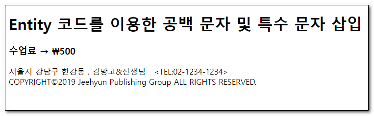 8<body>9 <h1> Entity 코드를 이용한 공백 문자 및 특수 문자 삽입 </h1>10 <h2>수업료 → ₩500</h2>11 <p>서울시 강남구 한강동 . 김망고&선생님 <TEL:02-1234-1234><br />12COPYRIGHT©2019 Mango Publishing Group ALL RIGHTS RESERVED.</p>13</body>14</html>05. 문단요소