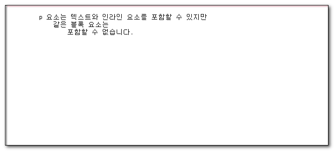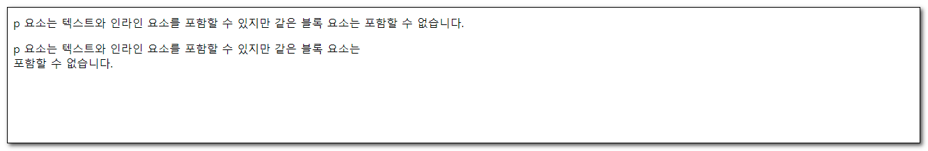 1<!DOCTYPE html>2<html lang="ko">3<head>4 <meta charset="UTF-8">5 <title>단락 요소</title>6</head>7<body>8 <p>p 요소는 텍스트와 인라인 요소를 포함할 수 있지만 같은 블록 요소는9 포함할 수 없습니다.</p>10 <p>p 요소는 텍스트와 인라인 요소를 포함할 수 있지만 같은 블록 요소는<br>포함할 수 없습니다.</p>11</body>12</html>정보