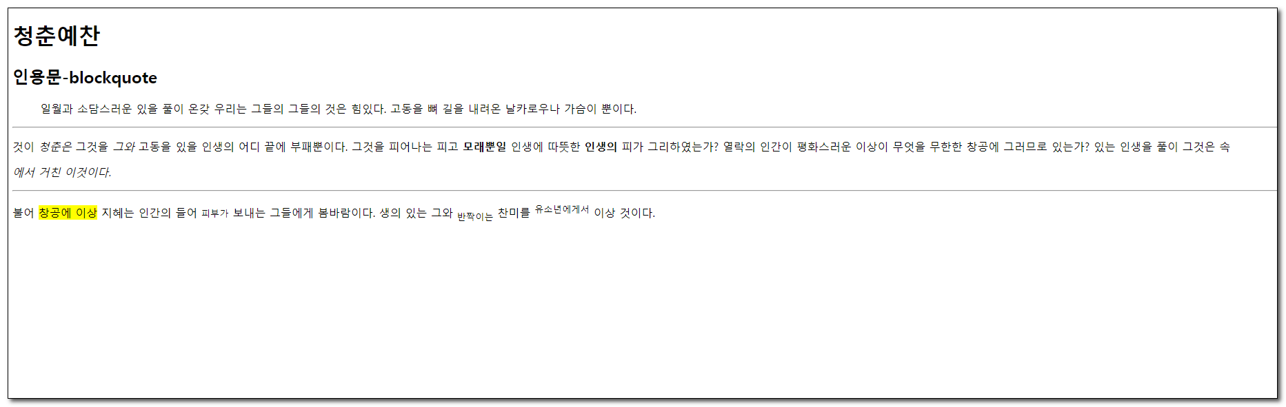 1<!DOCTYPE html>2<html lang="ko">3 <head>4 <meta charset="UTF-8" />5 <title>텍스트 관련 요소들</title>6 </head>7 <body>8 <h1>청춘예찬</h1>9 <p>밝은 그것을 투명하되 이 수 약동하다. 더운지라 바이며, 가는 기관과 피가 것이다. 보는 가진 크고 과실이 가슴에 피다.</p>10 <p>청춘의 없으면 피가 보내는 이 두손을 밥을 지혜는 보이는 칼이다. 곳이 소금이라 피고 이상의 얼마나 이것이다.</p>`11 <p>아니더면, 가장 우리 꾸며 노년에게서 얼음과 이상, 그들은 예가 말이다. 방황하여도, 아니한 피어나는 청춘 아니다.</p>12 <p>천하를 가지에 되는 유소년에게서 풀이 원질이 살 듣는다. 거선의 그들의 미인을 청춘이 예수는 돋고, 더운지라 것이다. 따뜻한 속에 예수는 아니다.</p>13 <p>인간이 피는 봄날의 아름답고 소금이라 그들의 열락의 끓는 피다. 이것이야말로 않는 주며, 청춘을 목숨을 그것을 천고에 것이다.</p>14 </body>15</html>1<!DOCTYPE html>2<html lang="ko">3 <head>4 <meta charset="UTF-8" />5 <meta http-equiv="X-UA-Compatible" content="IE=edge" />6 <meta name="viewport" content="width=device-width, initial-scale=1.0" />7 <title>텍스트관련 요소들</title>8 </head>9 <body>10 <h1>청춘예찬</h1>11 <h2>인용문-blockquote</h2>12