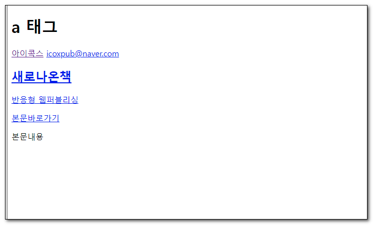 1<!DOCTYPE html>2<html lang="ko">3<head>4 <meta charset="UTF-8">5 <title>링크</title>6</head>7<body>8 <h1>a 태그</h1>9 <a href="http://icoxpublish.com/">아이콕스</a>10 <a href="mailto:icoxpub@naver.com">icoxpub@naver.com</a>11 <a href="#">12 <section>13 <h2>새로나온책</h2>14 <p>반응형 웹퍼블리싱</p>15 </section>16 </a>17 <a href="#content">본문바로가기</a>18 <p id="content">본문내용</p>19</body>20</html>