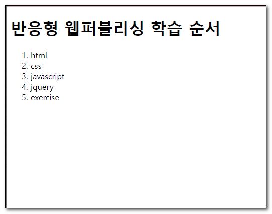 9<body>10 <h1>반응형 웹퍼블리싱 학습 순서</h1>11 <ol>12 <li>html</li>13 <li>css</li>14 <li>javascript</li>15 <li>jquery</li>16 <li>exercise</li>17 </ol>18</body>19