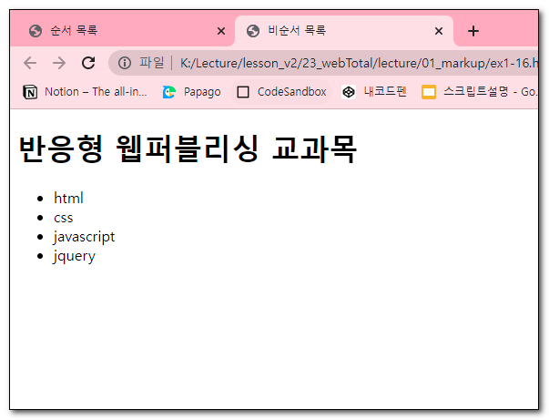 9<body>10 <h1>반응형 웹퍼블리싱 교과목</h1>11 <ul>12 <li>html</li>13 <li>css</li>14 <li>javascript</li>15 <li>jquery</li>16 </ul>17</body>18