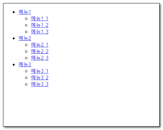 1<!DOCTYPE html>2<html lang="ko">3<head>4 <meta charset="UTF-8">5 <title>2단 메뉴</title>6</head>7<body>8 <ul>9 <li><a href="#">메뉴1</a></li>10 <li><a href="#">메뉴2</a></li>11 <li><a href="#">메뉴3</a></li>12 </ul>13</body>14</html>1<!DOCTYPE html>2<html lang="ko">3<head>4 <meta charset="UTF-8">5 <title>2단 메뉴</title>6</head>7<body>8 <ul>9 <li><a href="#">메뉴1</a>10 <ul>11 <li><a href="#">메뉴1_1</a></li>12 <li><a href="#">메뉴1_2</a></li>13 <li><a href="#">메뉴1_3</a></li>14 </ul>15 </li>16 <li><a href="#">메뉴2</a>17 <ul>18 <li><a href="#">메뉴2_1</a></li>19 <li><a href="#">메뉴2_2</a></li>20 <li><a href="#">메뉴2_3</a></li>21 </ul>22 </li>23 <li><a href="#">메뉴3</a>24 <ul>25 <li><a href="#">메뉴3_1</a></li>26 <li><a href="#">메뉴3_2</a></li>27 <li><a href="#">메뉴3_3</a></li>28 </ul>29 </li>30 </ul>31</body>32</html>Dl